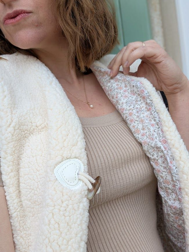 La particularité de celui ci ? Il est tout doux en sherpa avec un joli bouton brandebourg pour le côté ludique et esthétique :)